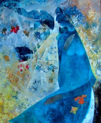 Một ngày tôi gặp người thiếu nữ đẹp ngời áo vàng hoa cúc ở nhà họa sĩ Nguyễn Đình Thuần. Tóc nàng là những dải mây mang sóng đại dương xanh ngát. Ánh trăng hoàng thành lấp lánh trải lân tinh lên tóc nàng làm nổi bật bọt sóng trắng giữa bờ tóc đen. Đằng sau khuôn mặt thanh tú là vùng trời đá dựng, tạo một vòng cung ôm ấp lấy mảnh trăng chưa chín nửa vàng, nửa xanh. Bố cục xanh, lam, chàm, tím đậm lạt khiến nổi bật làn da và màu áo quyền quí của những triều đại Huế xa xưa. Nàng gợi nhớ một thời “Ngày xưa Hoàng Thị”, em tan trường về, anh theo Ngọ về của bao chàng trai si tình, mê luyến.